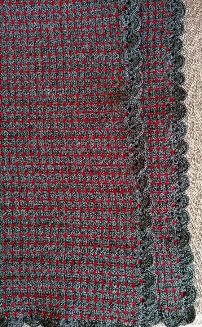 Gri renkte, nakışlı desenli ve fırfırlı kenarlara sahip örgü çocuk battaniyesi, sıcaklık ve şıklık sunar.