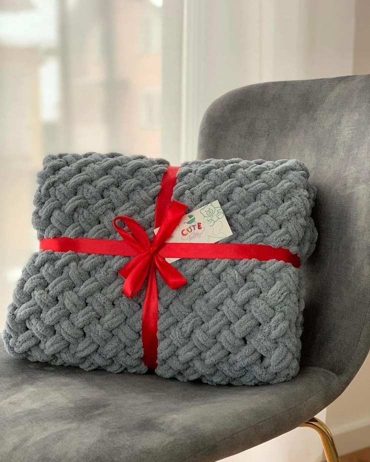 Gri renkte, nakışlı desene sahip örgü çocuk battaniyesi, kırmızı kurdele ile paketlenmiştir. Rahat ve şık bir üründür.