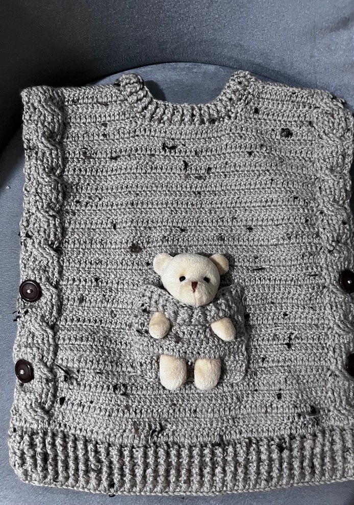 Düğmeli ve nakış detaylı gri örgü çocuk yeleği , yumuşak ayıcık süsüyle tamamlanmıştır. İstenilen yaşa ve bedene göre yapılabilir
