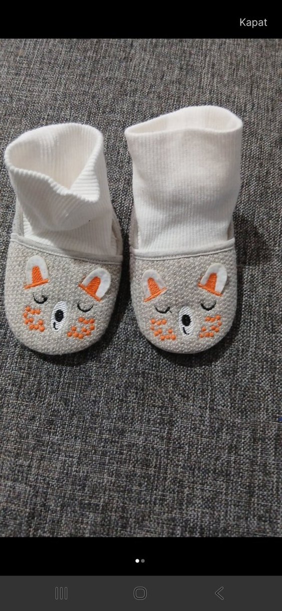 Gri renkli, örgü erkek bebek patiklerinde nakışlı hayvan yüzleri ve yumuşak manşetler bulunur.