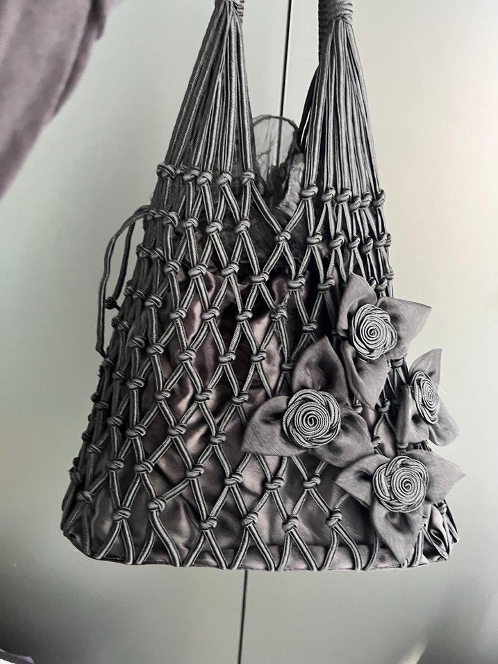 Gri örgü kadının çantası, nakışlı desen ve fırfırlı çiçek detaylarıyla bohem ve avangart tarzı bir araya getiriyor.