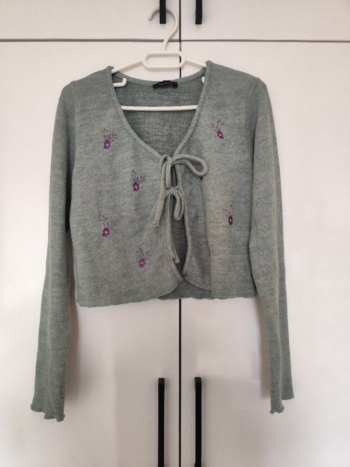 Gri renkli, uzun kollu ve bol kesim örgü hırka, mor nakış detayları ve ön bağcıklarla süslenmiştir. Rahat ve bohem tarzda, günlük kullanıma uygundur.