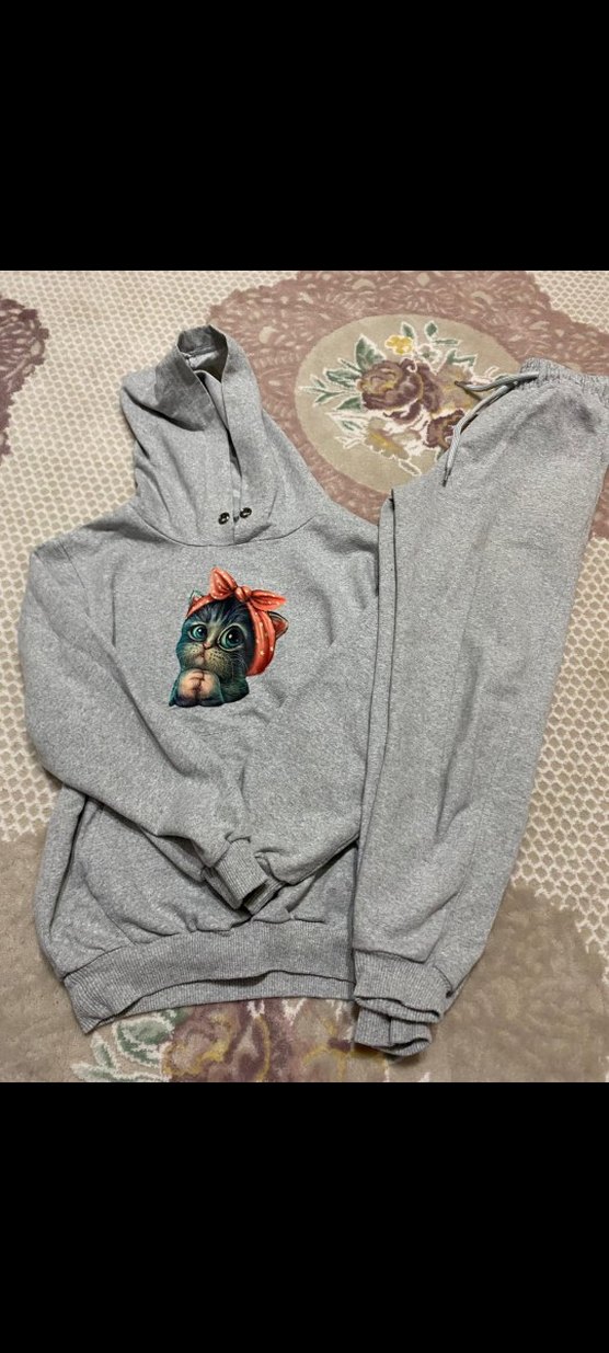 Gri örgü kumaştan yapılmış, önünde nakışlı kedi deseni bulunan kapüşonlu sweatshirt ve paçaları lastikli eşofman altından oluşan sokak stili takımı.
