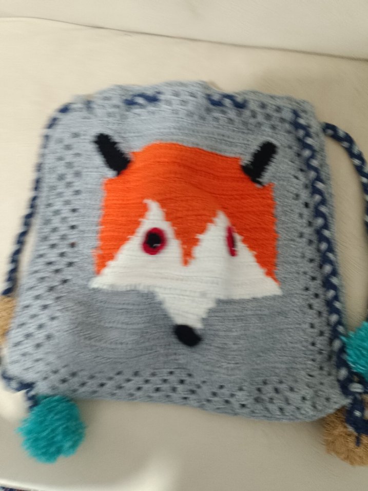 Gri renkte, örgü dokuda ve nakışlı tilki desenli kız çocuk cantasii, yumuşak dokusuyla rahatlık sağlar.