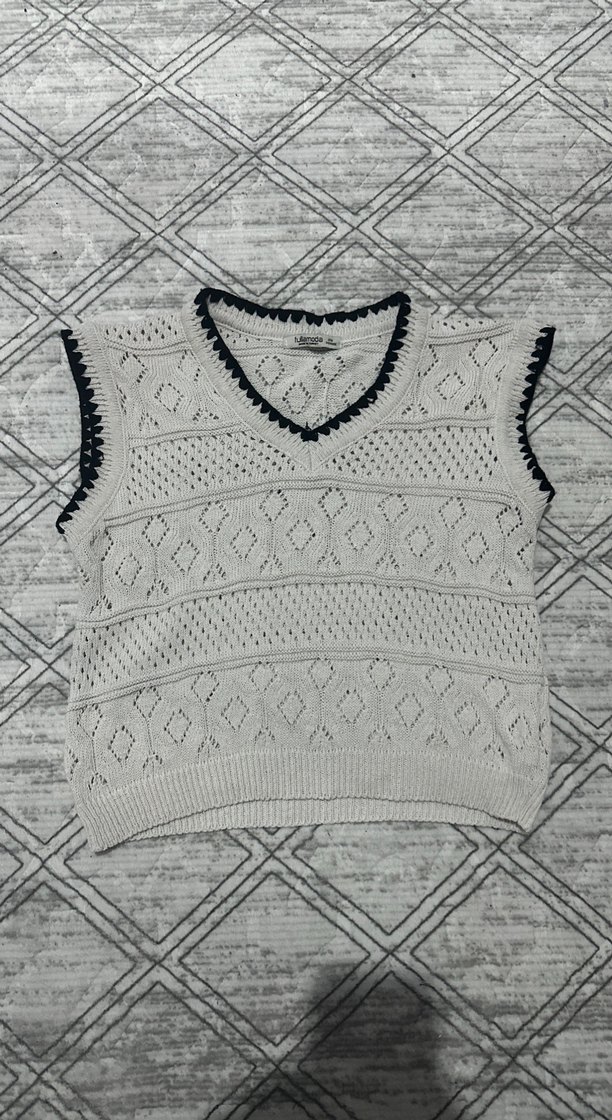 Gri renkte, nakışlı desenli, V yaka ve kolsuz örgü süveter, bol kesim ve rahat bohem tarzıyla günlük kullanım için uygundur.