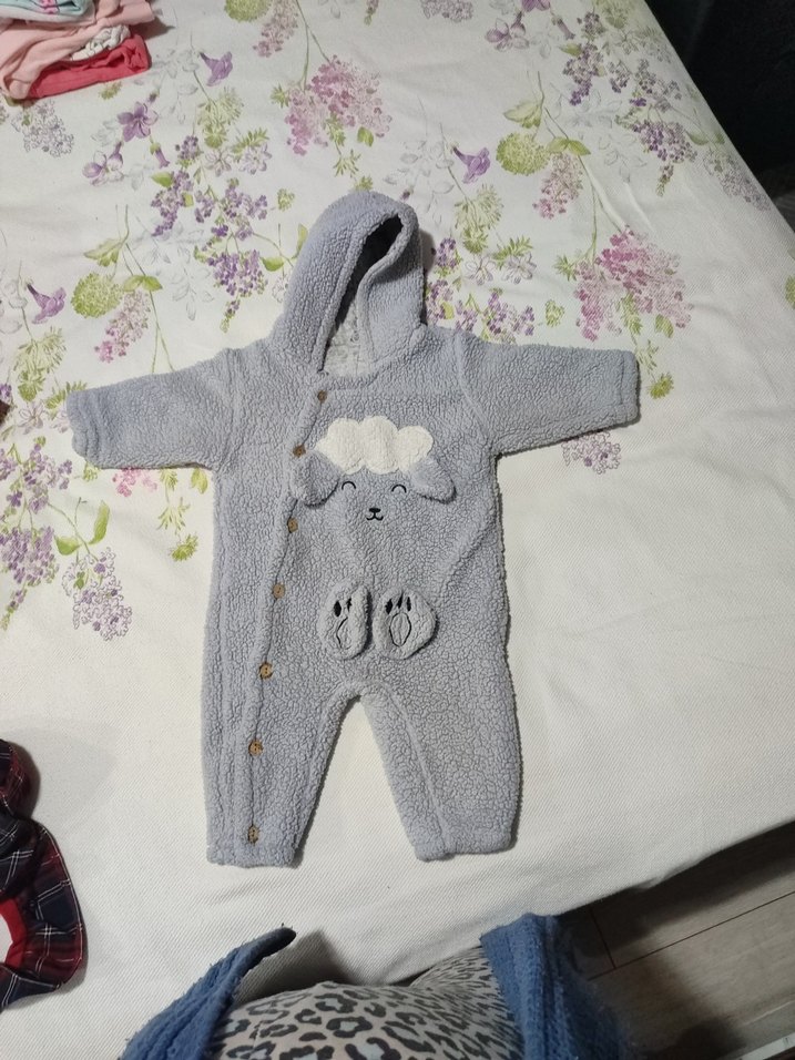 Gri renkte, yumuşak tüylü kumaştan örme dokulu bebek tulumu. Nakışlı detaylar ve kapüşonlu tasarıma sahiptir. Sokak tarzı için uygundur. ❄️