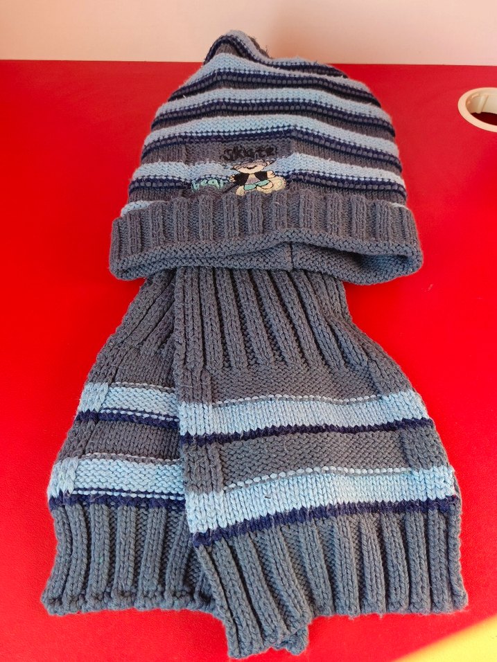 Gri renkli, nakış detaylı ve çizgili desenlere sahip örme bere ve atkı seti, trend sokak giyimine uygun.