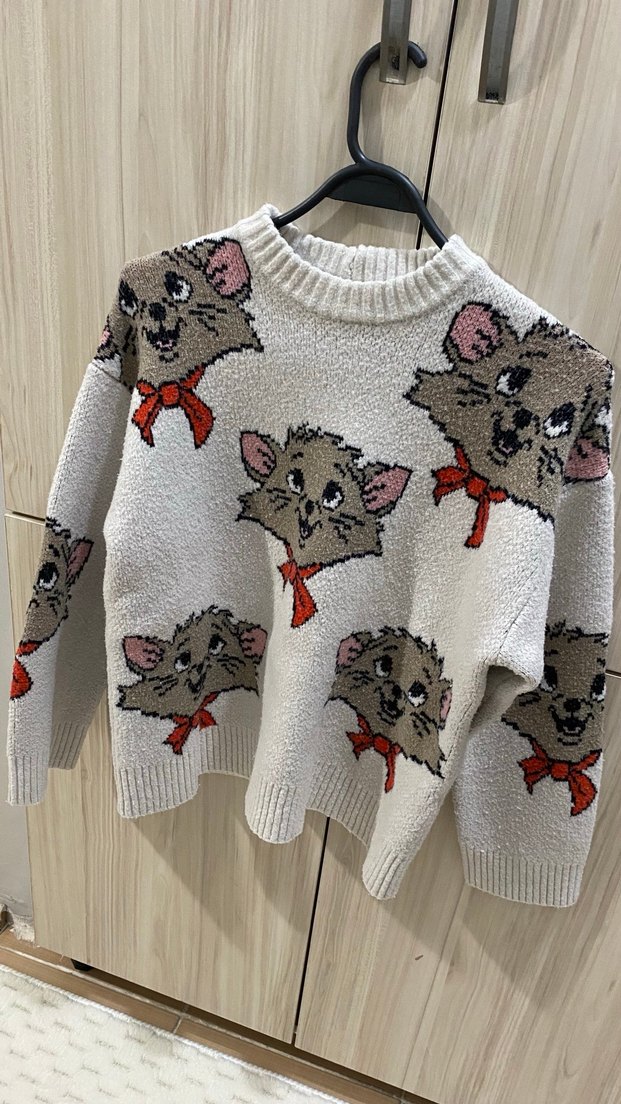 Gri renkli, nakışlı oyuncu kedi yüzleriyle süslenmiş, bol kesim ve yuvarlak yaka örme kadın kazak.