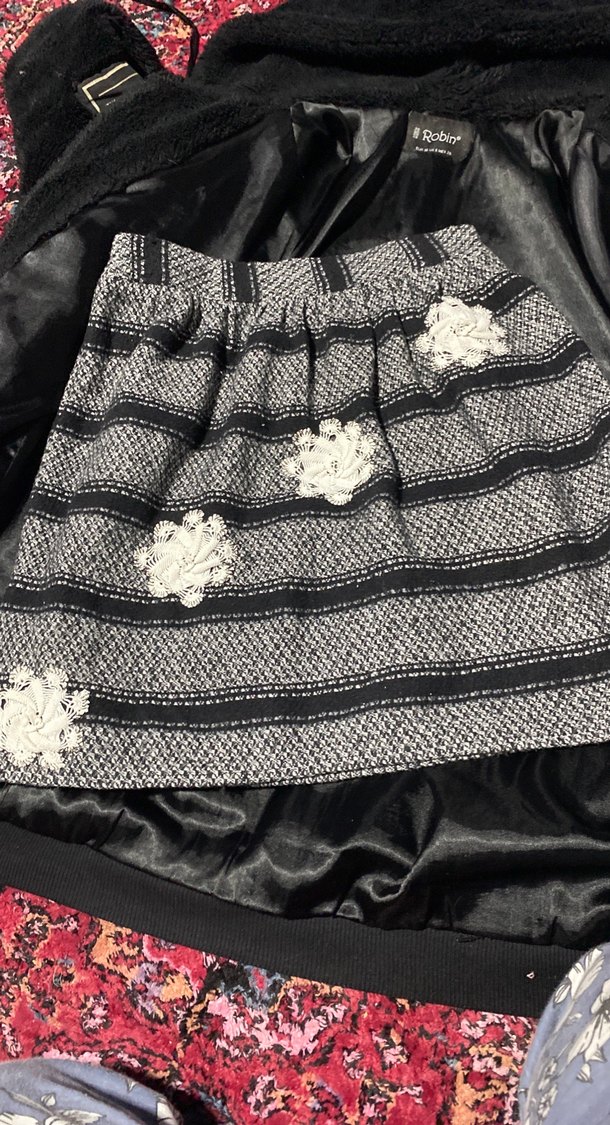 M beden Gri renkli, nakışlı çiçek detaylı ve fırfırlı, bol kesim bohem mini etek. Günlük kullanıma uygun.