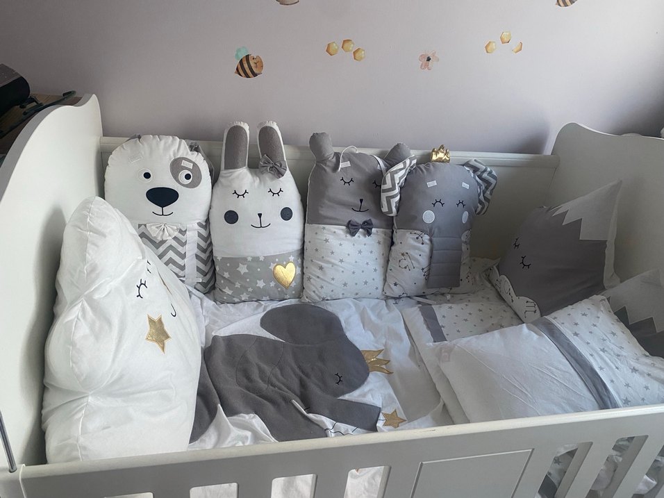 6 adet Nakışlı hayvan figürlü gri pamuklu çocuk uyku yastıkları. Yumuşak ve rahat, çocuk yatağı için uygun. Hiç bir sorunu yoktur 1 adet yastık kılıfı /çarşaf / dolgulu ve figürlü yorgan / dolgulu alt açma minderi ölçüsü 75/130 dur