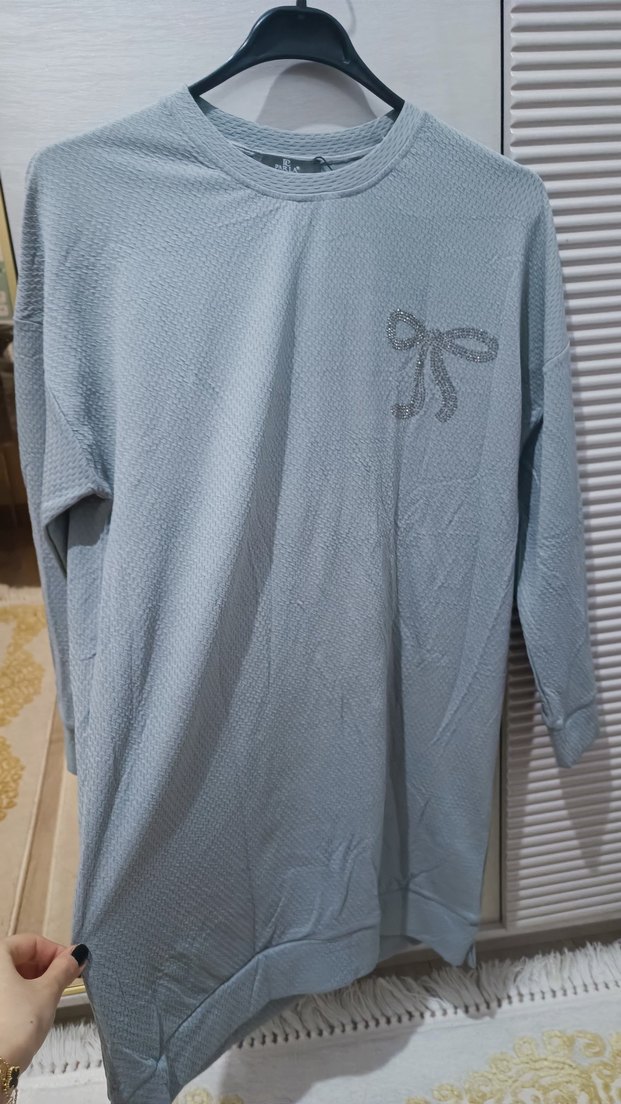 Gri renkte, uzun kollu, yuvarlak yakalı, pamuklu kumaştan yapılmış, nakışlı ve fiyonk detaylı bol kesim hamile tuniktir. Rahat sokak stili için uygundur.