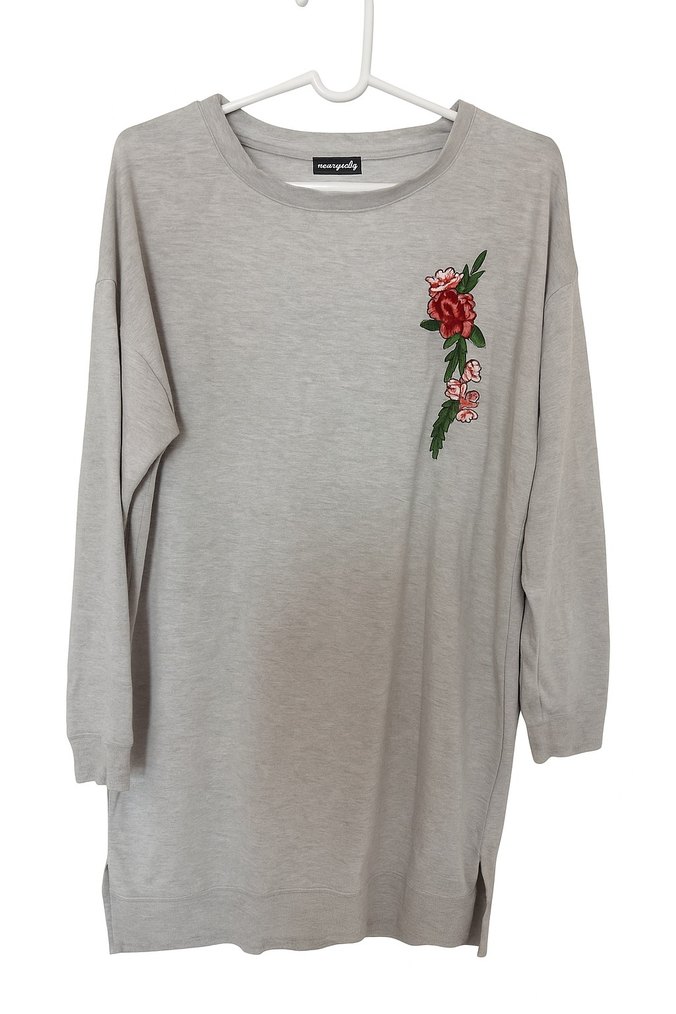 Gri renkte, uzun kollu ve yuvarlak yakalı, nakışlı çiçek detaylı, pamuklu kumaştan yapılmış bol kesim sweatshirt. Günlük kullanım için uygundur.