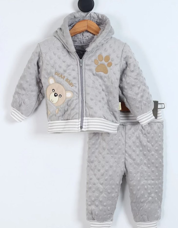 Gri renkli, kapüşonlu ve fermuarlı peluş bebek tulumu, nakışlı ayı deseni ve yumuşak kürk detaylarıyla sıcak tutar.