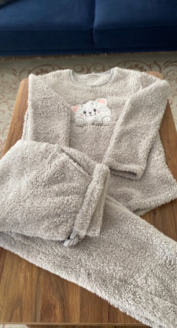 Gri renkli, yumuşak peluş kumaştan yapılmış, önünde nakışlı kedi deseni bulunan rahat ve konforlu gece kıyafeti.