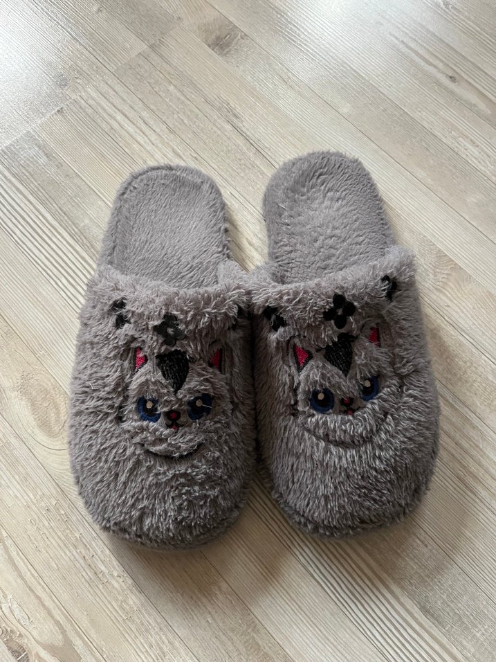 Gri renkte, peluş kumaştan yapılmış, tüylü detaylı ve nakışlı kedi desenli kadın terlikleri. Bohem tarzı ve platform topuklu, evde rahat kullanım için uygun.