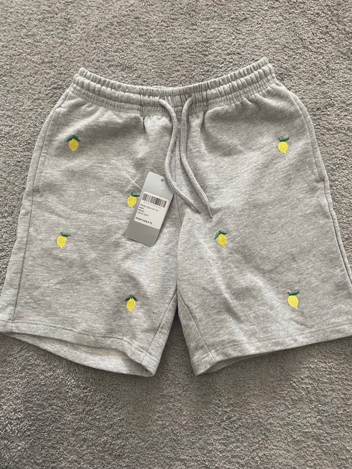 Yumuşak pamuklu kumaştan, bol kesim gri mini şort. Üzerinde limon nakışları detaylar bulunur. Günlük rahat kullanım için uygundur.