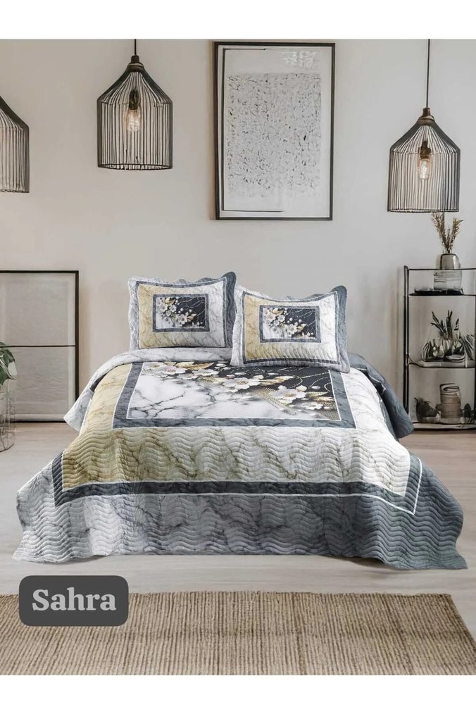 Sahra yatak örtüsü, gri tonlarda nakışlı desenlere sahip olup yatak odasına doku ve şıklık katıyor. Uyku yastıkları dahil. ️