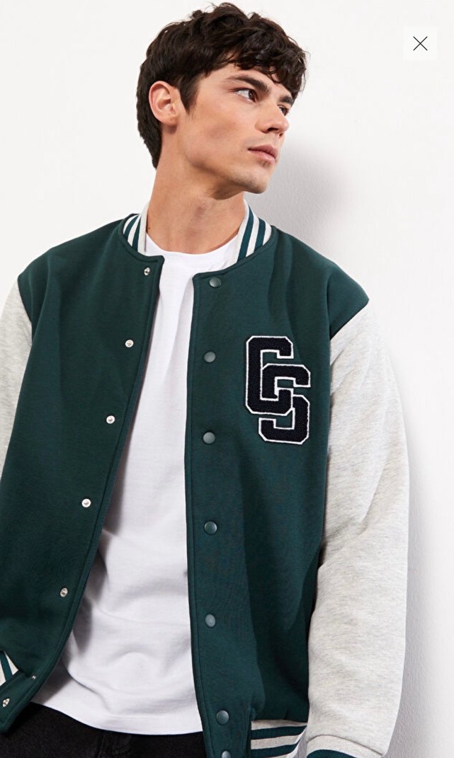 Bu erkek kolej ceketi, bol kesim, uzun kollu ve yuvarlak yaka detaylarına sahiptir. Düğmeli ön kısmı ve nakışlı desenleriyle spor ve sokak stilini birleştirir.
