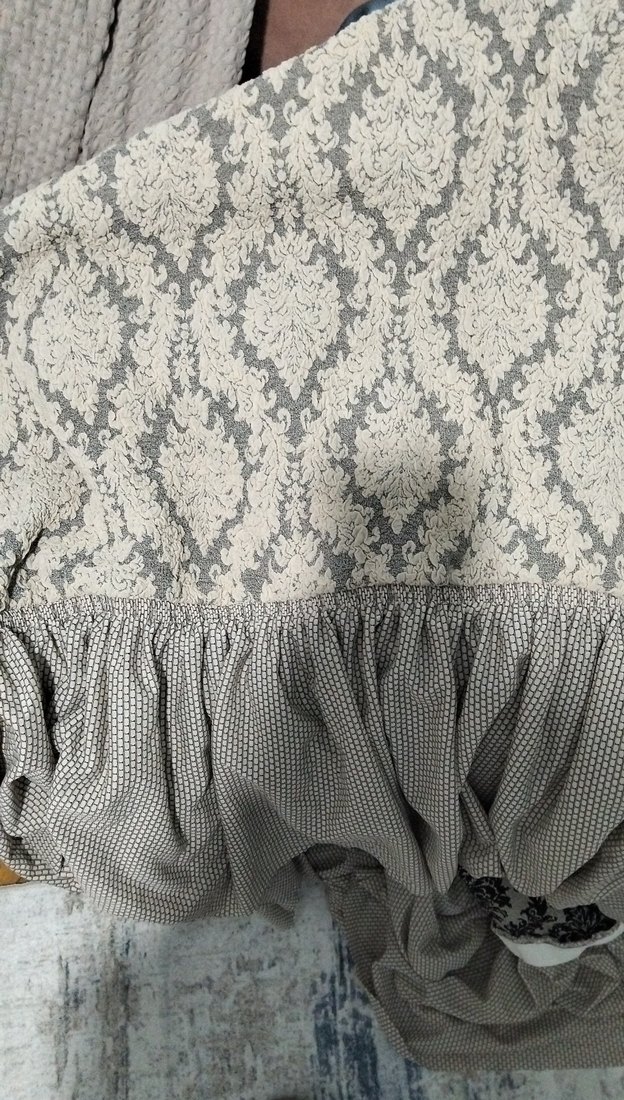Nakışlı desenlere sahip gri koltuk örtüsü, detaylı işçilik ve büzgülü dokusuyla öne çıkar. ️tek kişilik
