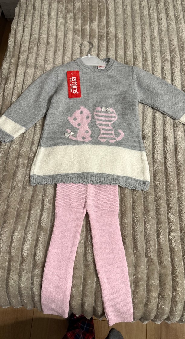 Gri Nakışlı Triko Bebek Kız Takımı Yün taytlı