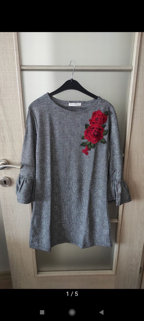 Gri triko kumaştan, uzun kollu ve salaş kesimli bir elbisedir .Yuvarlak yakalı, göğüs kısmında kırmızı nakışlı çiçek detayı bulunur. Günlük sokak stili için uygundur.