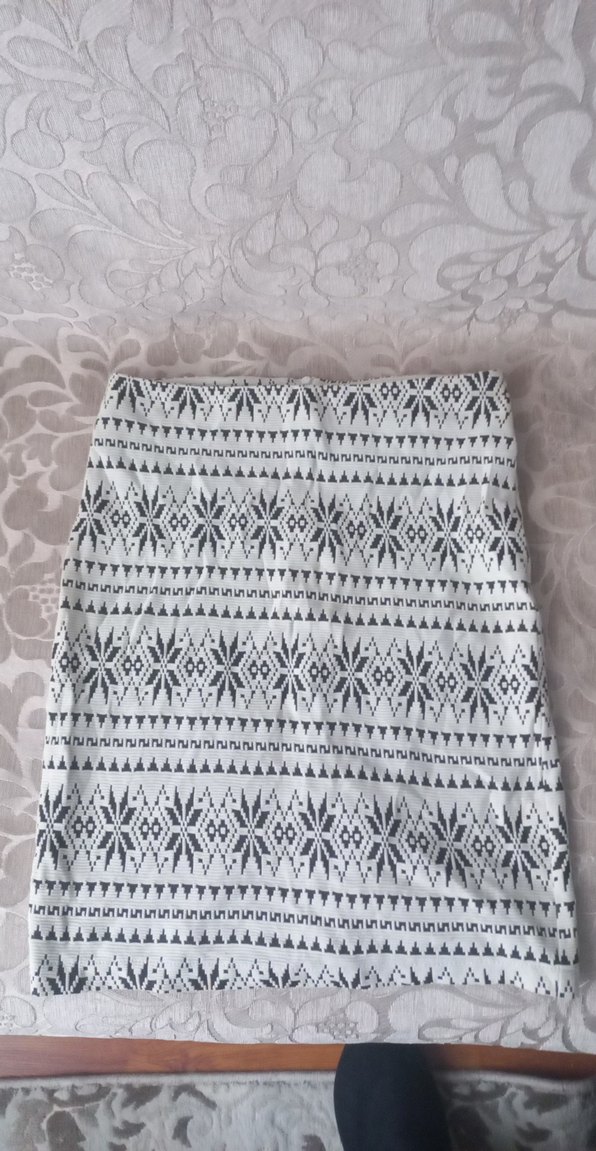 Gri nakışlı geometrik desenlere sahip triko, vücuda oturan midi etek. Bohem tarzı için uygun, günlük kullanıma rahat bir hava katıyor.