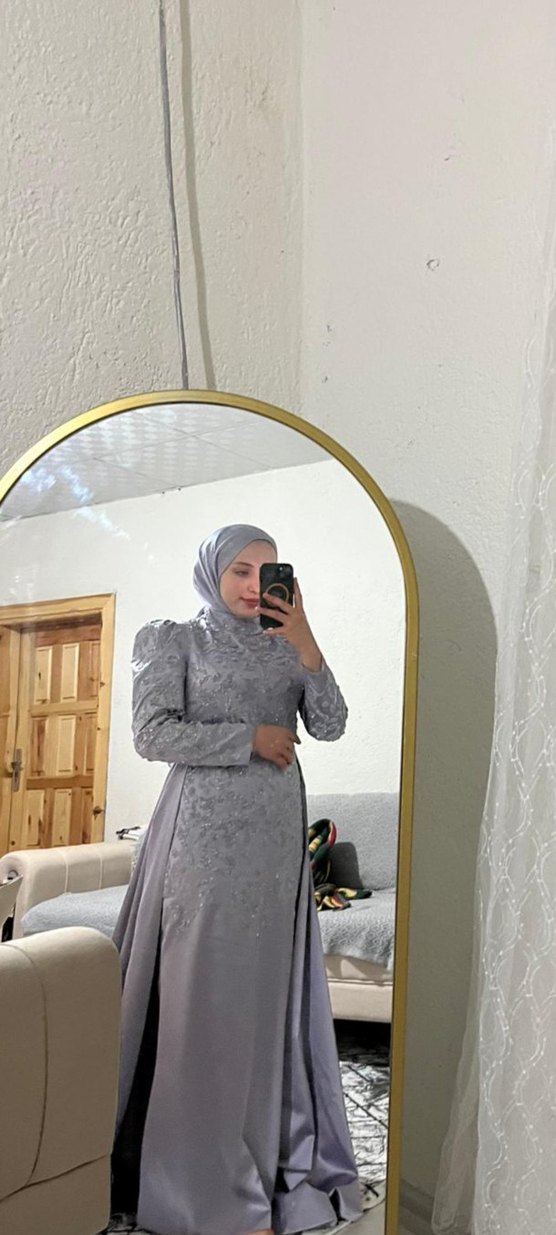 Gri renkli, nakış işlemeli, uzun ve vücuda oturan bu abiye elbise yüksek yaka, uzun kollu ve drapeli tasarıma sahiptir.