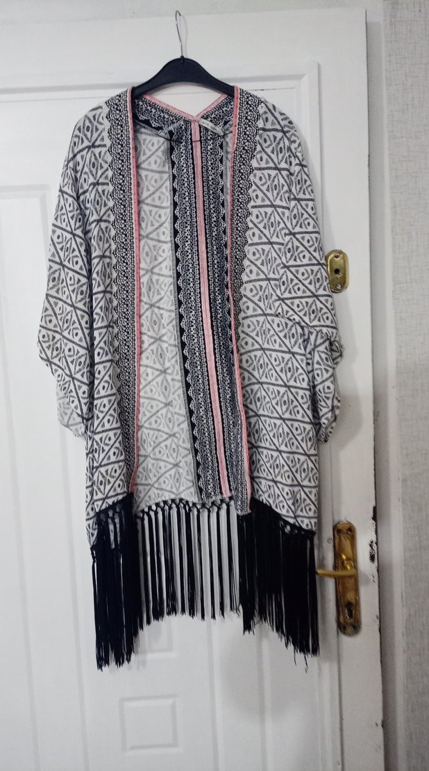 Nakışlı desenlere sahip uzun gri kimono, bol kesim, uzun kollu ve V yakalıdır. Püskül detayları bohem tarzı tamamlar.