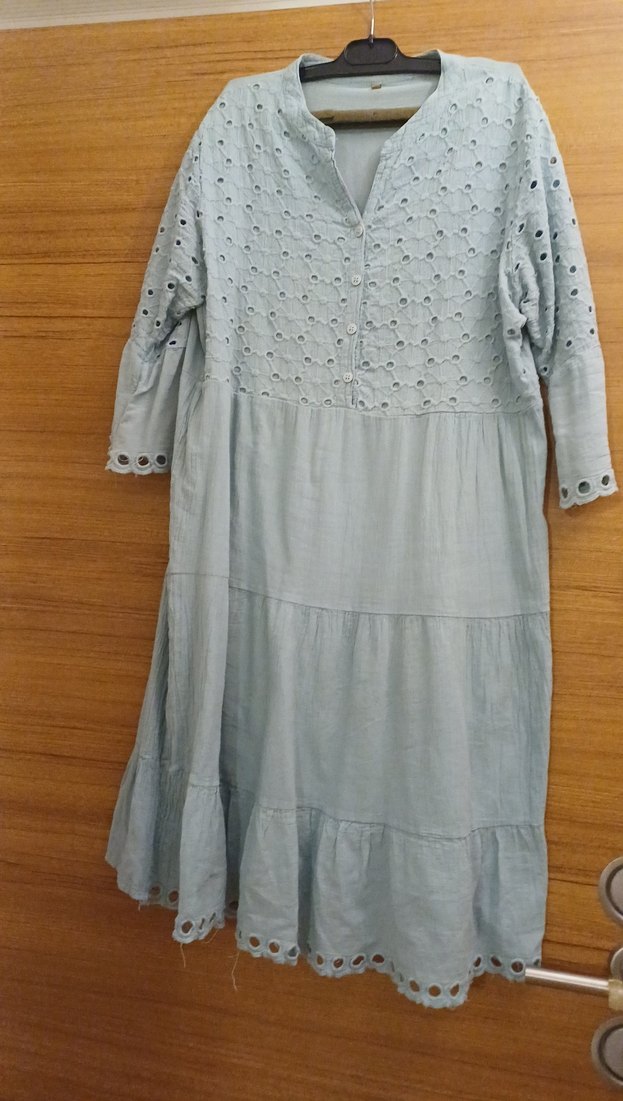 Gri ,nakışlı diz altında, uzun keten bohem elbise, bol kesim ve volan ve kol boyu dirsektedir, cok hafif fırfır detaylı ve yuvarlak yaka,önden düğmeli ,astarlı,günlük kullanıma uygundur.