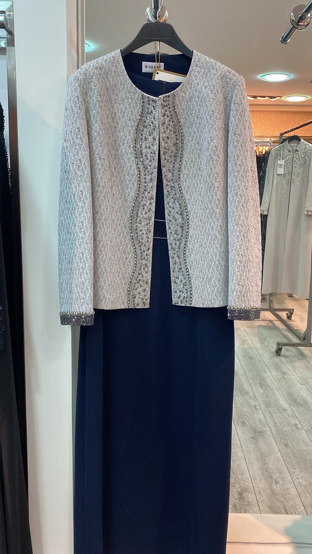 Gri renkte, nakışlı dantel detaylı, sentetik kumaştan uzun kadın takımı. Notlu yaka ve uzun kolludur, ofis için uygundur. 44/46 beden uyumlu