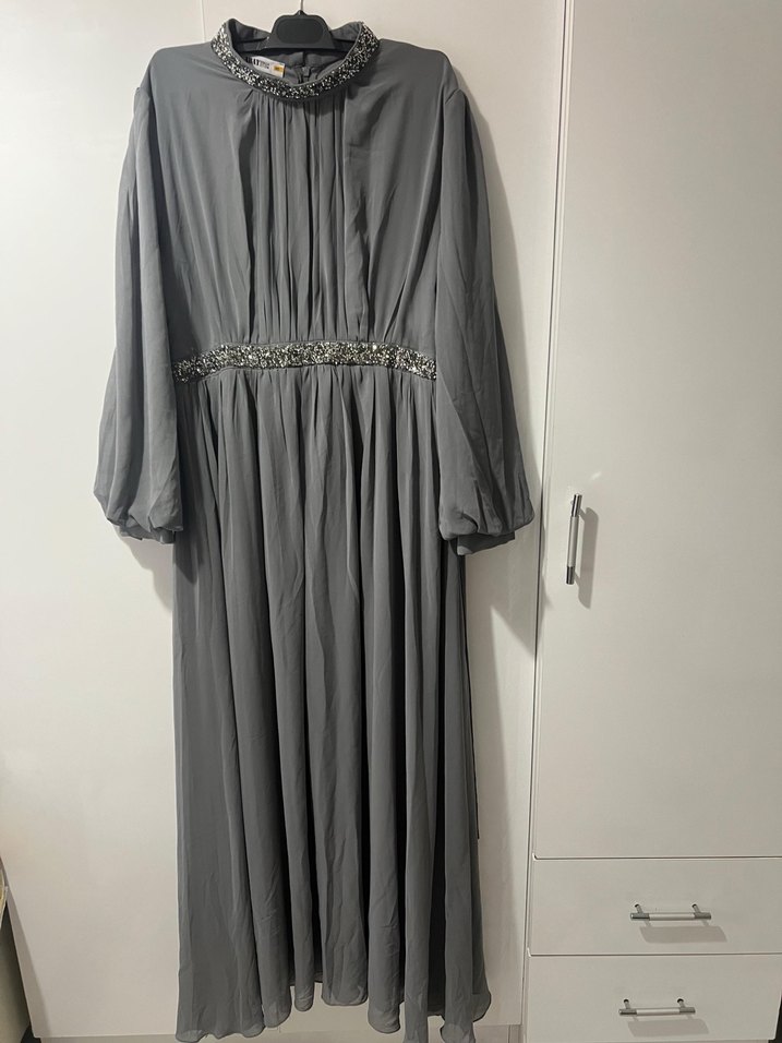 Yüksek yakalı, uzun kollu ve bol kesim gri uzun abiye elbise, drapeli ve nakışlı detaylara sahiptir. Düğünler için modern klasik ve vintage tarzda bir seçenektir.