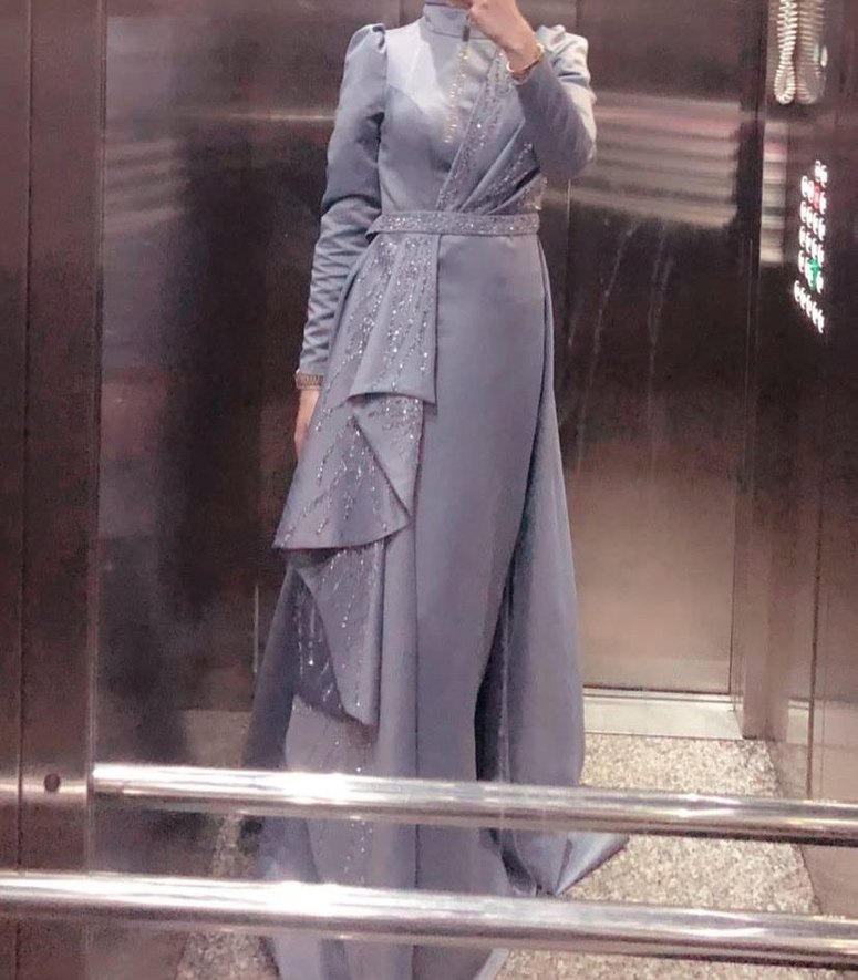 Gri Nakışlı Uzun Kollu Abiye Elbise
