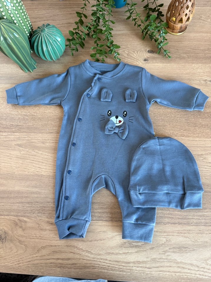 Gri renkte, uzun kollu ve bisiklet yaka bebek tulumu, yumuşak örme kumaştan ve nakış detaylıdır. Üzerine uyumlu şapka dahildir. 0-9 ay aralığı mevcuttur