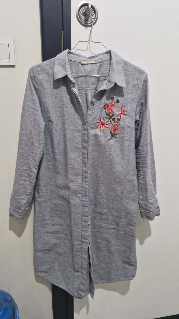Gri renkli, düğmeli, nakışlı çiçek desenli uzun kollu gömlek. Notlu yaka ve bol kesimle günlük rahat kullanım için uygundur.
