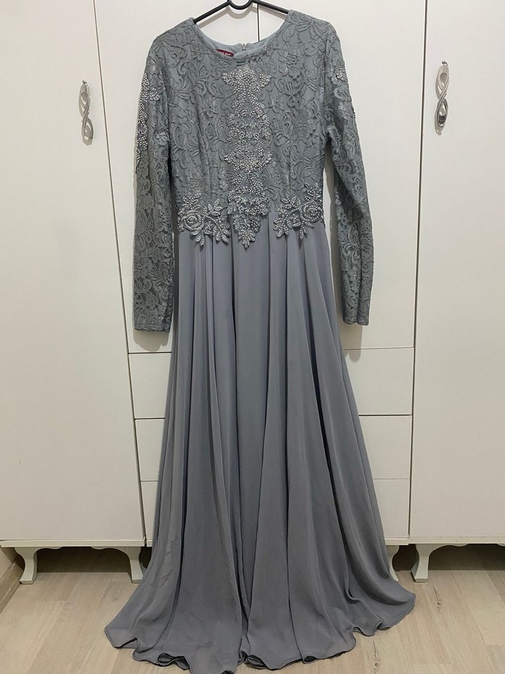 Bu uzun gri abiye elbise, bol kesim, drapeli kumaş, uzun kol ve nakışlı detaylara sahip. Yuvarlak yaka ve modern klasik tarzıyla düğünler için uygun.