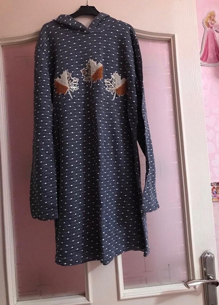 Uzun ve bol kesim kadın sabahlık, uzun kollu ve gri zemin üzerine nakışlı yaprak desenleriyle bohem ve rahat bir tarz sunar.