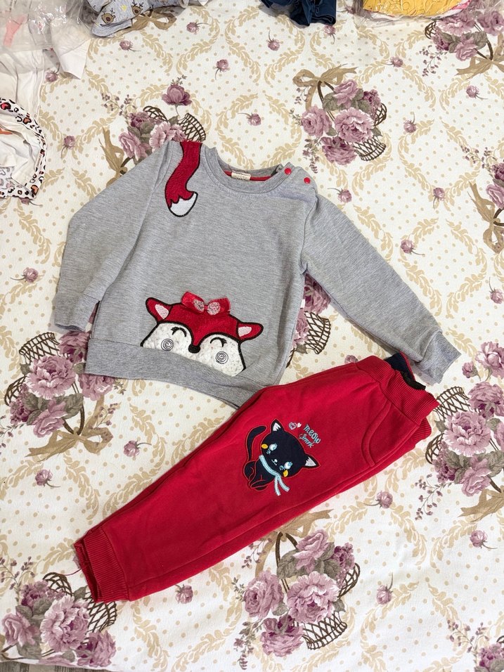 Gri renkli, nakışlı tilki detaylı uzun kollu örme üst ve siyah kedi nakışlı kırmızı pantolonlu yumuşak ve sıcak kumaştan erkek bebek takımı.
