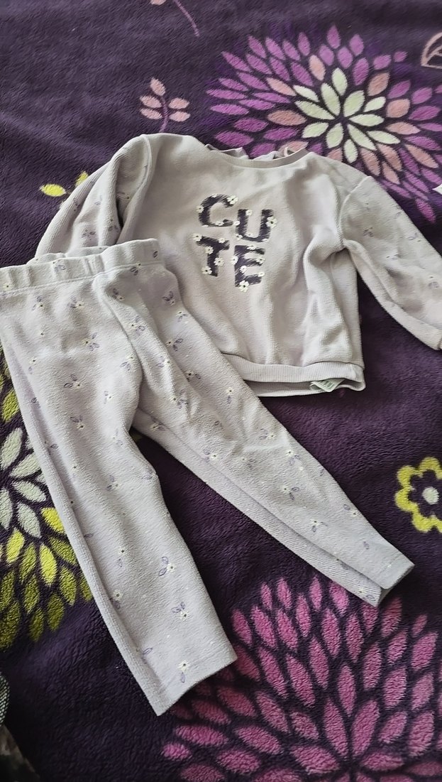 Gri renkli, örgü kumaştan uzun kollu üst ve nakışlı pantolondan oluşan bebek kız takımı. Üst kısmında "CUTE" yazısı işlemelidir. kadife kunaşa sship