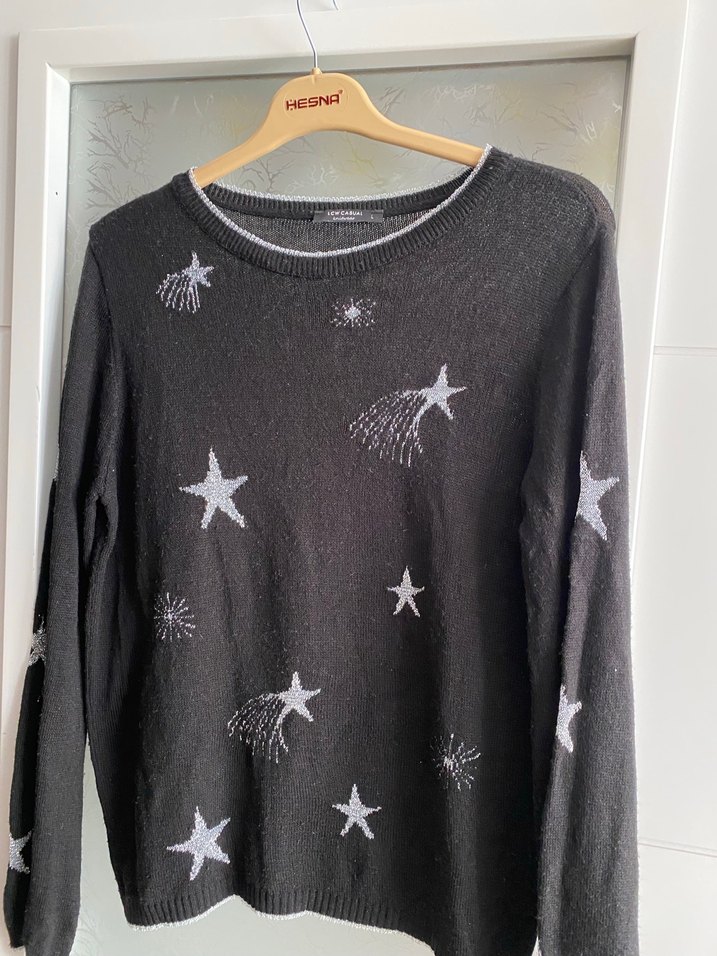 Gri renkte, nakışlı yıldız desenlerine sahip uzun kollu örgü kazak. Salaş kesimi ve normal midi boyuyla rahat ve şık bir günlük tercih.