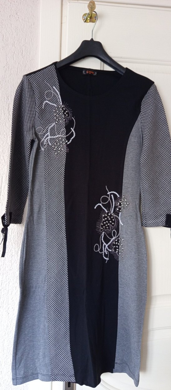 Bu dar kesim uzun triko elbise, bisiklet yaka ve uzun kolludur. Gri tonları nakış detaylarıyla birleşerek gotik, avangart bir stil sunar. Günlük kullanım için uygundur.
