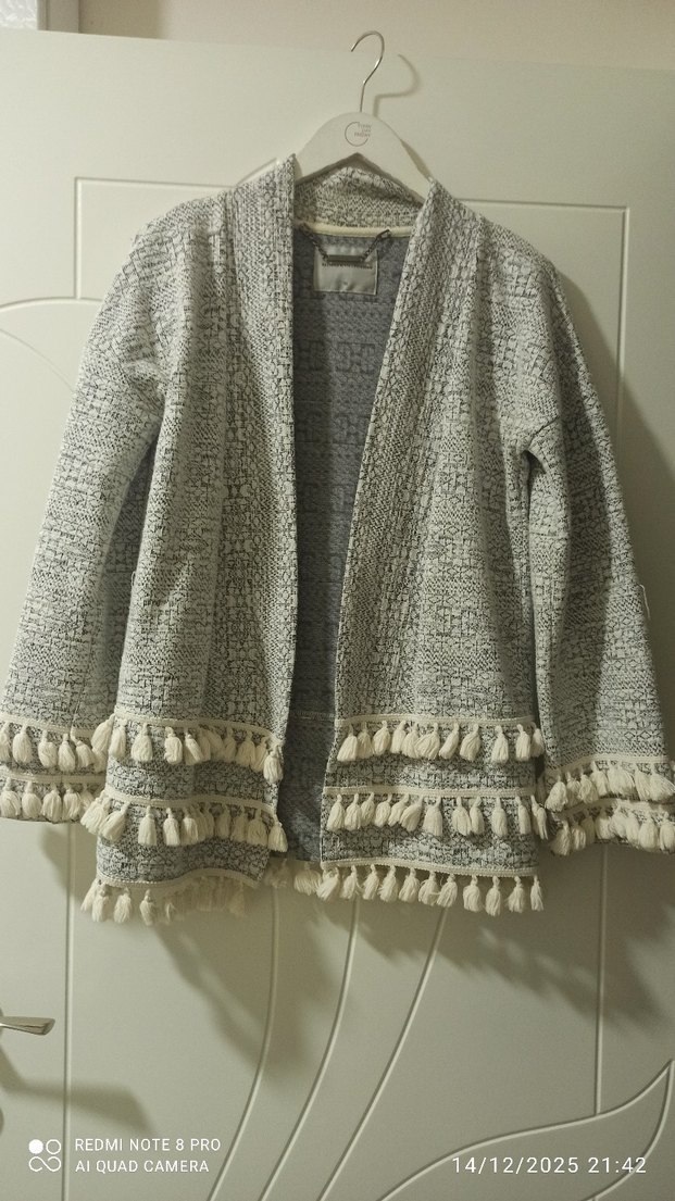 Gri renkte, nakışlı desenlere ve püskül detaylara sahip uzun kollu, bol kesim triko hırka. Notlu yaka tasarımıyla bohem tarzda rahat bir seçenek.