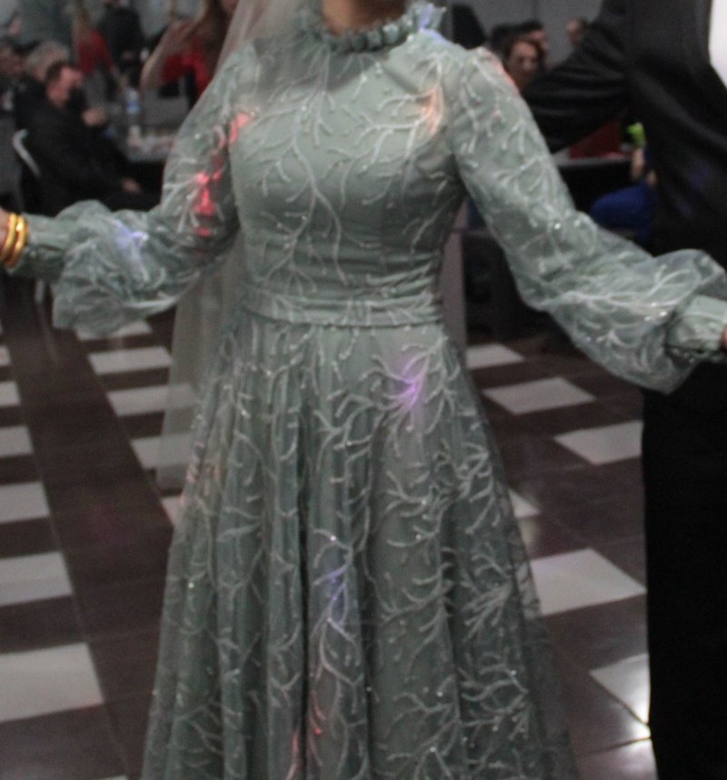 Yüksek yakalı, uzun kollu, drapeli ve nakışlı desene sahip gri tonlarında vintage uzun abiye elbise. Düğün için uygun, vücuda oturan kesim. tesettüre uygun abiye elbise söz nişan düğün için uygundur şık bir model