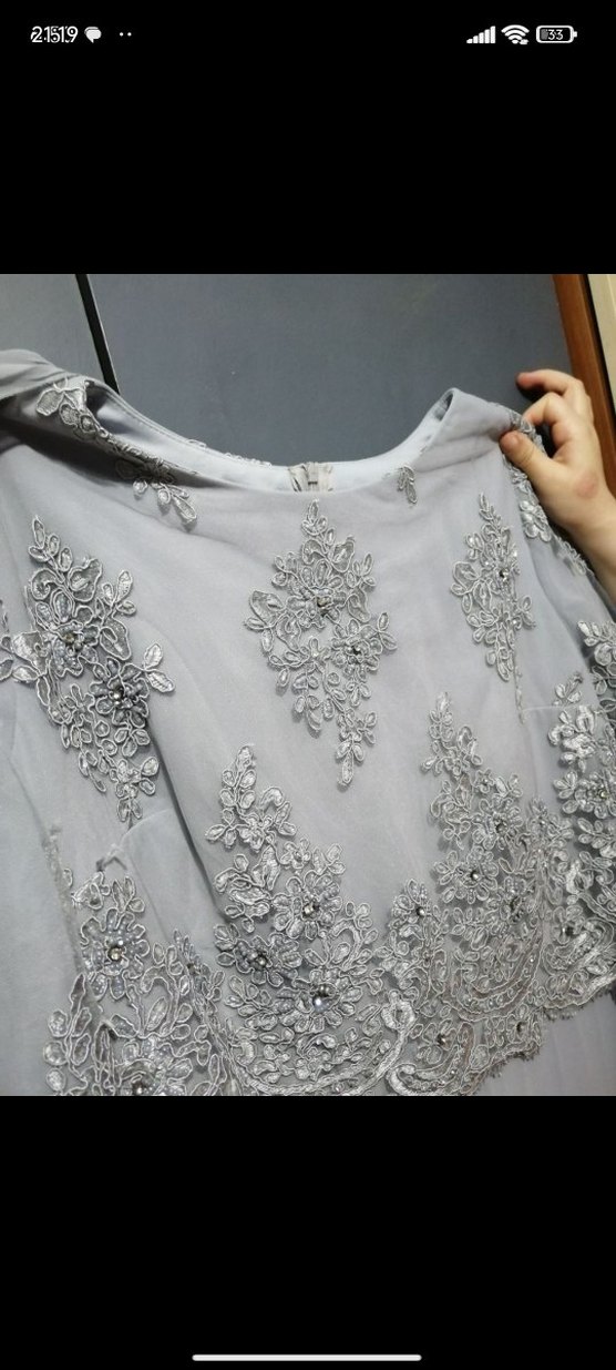 Gri uzun kollu, nakışlı ve bol kesim elbise, düğünler için uygun şık bir seçenek. ✨