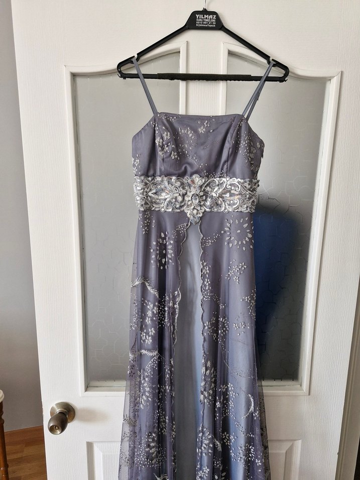 Gri renkte, nakış detaylı ve straplez uzun abiye elbise. Drapeli tasarımı, klasik ve vintage stilin birleşimini sunar. Regular fit ve kolsuz yapıda, düğünler için uygun.