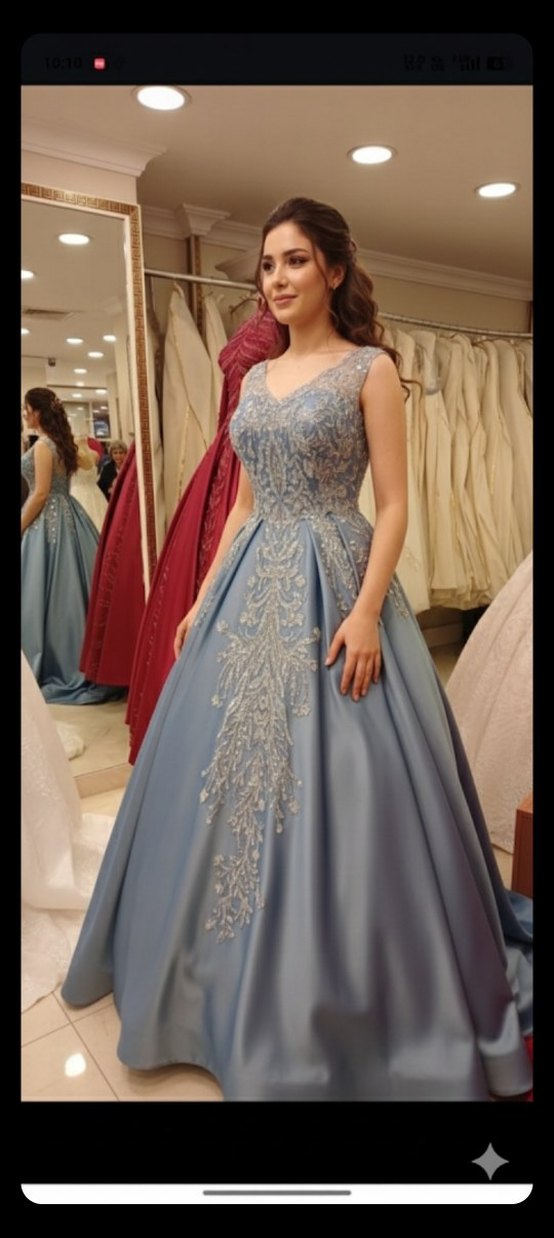 Drapeli ve nakışlı desenlere sahip gri renkli, kolsuz, V yakalı, düzenli kesim nişan elbisesi. Düğünler için uygundur.