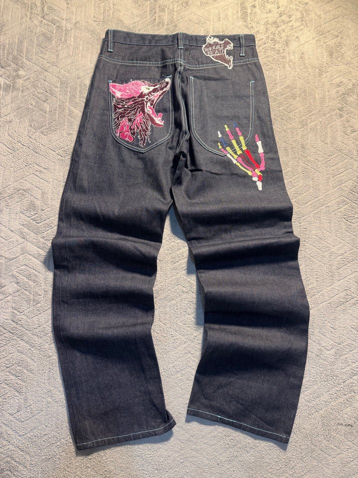 Gri Nakışlı ve Kürklü Oversize Kot Pantolon