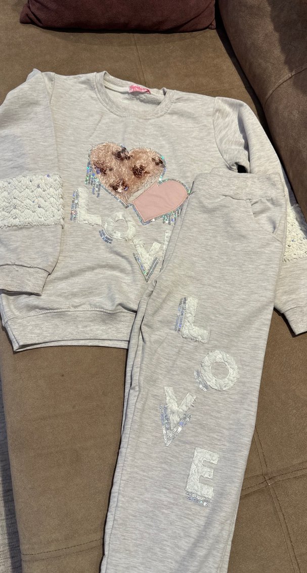 Gri renkte, nakışlı kalp desenleri ve işleme detaylı, uzun kollu, bisiklet yaka, bol kesim kız eşofman takımı. Altında 'LOVE' yazısı bulunur. Pazarlık payı mevcuttur.