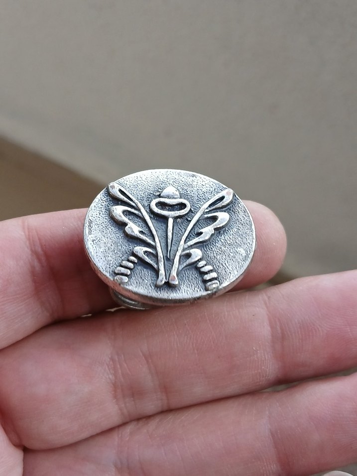 Gri renkte, nakış desenli ve düğmeli vintage kadın yüzüğü, günlük kullanıma uygundur.