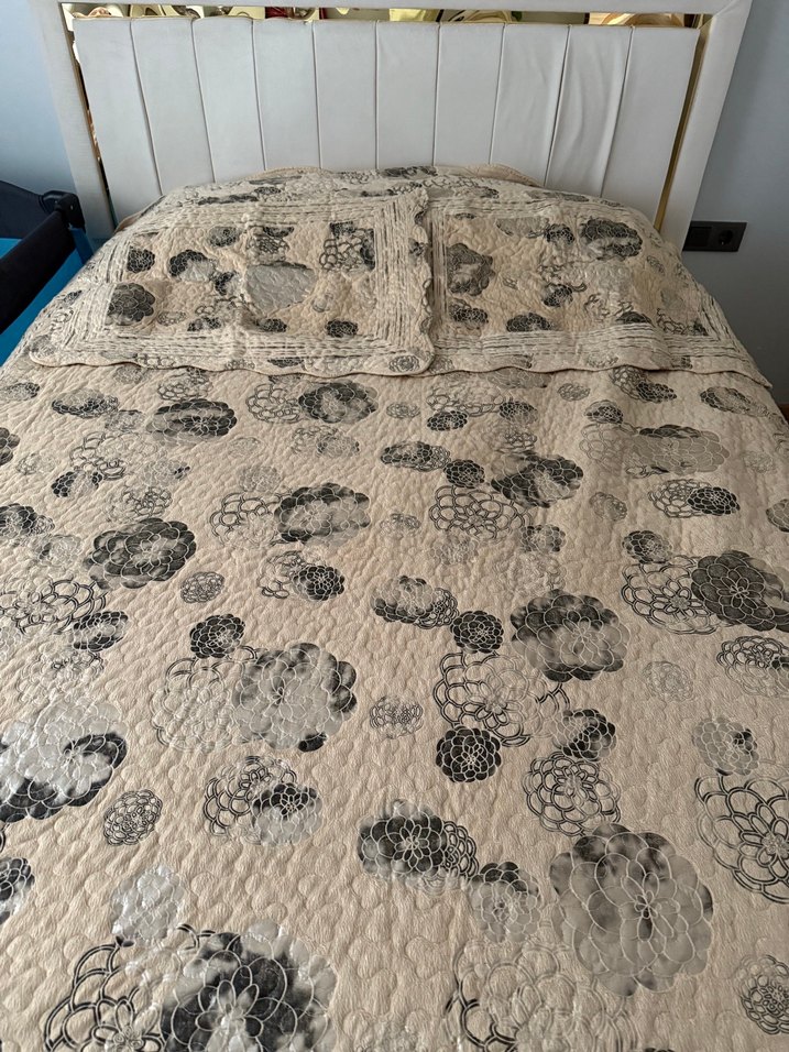 Nakışlı çiçek desenlerine sahip gri yatak örtüsü, yatağa doku ve zarif bir görünüm katıyor. Yumuşak ve detaylı tasarım yatak odasını güzelleştirir. ️