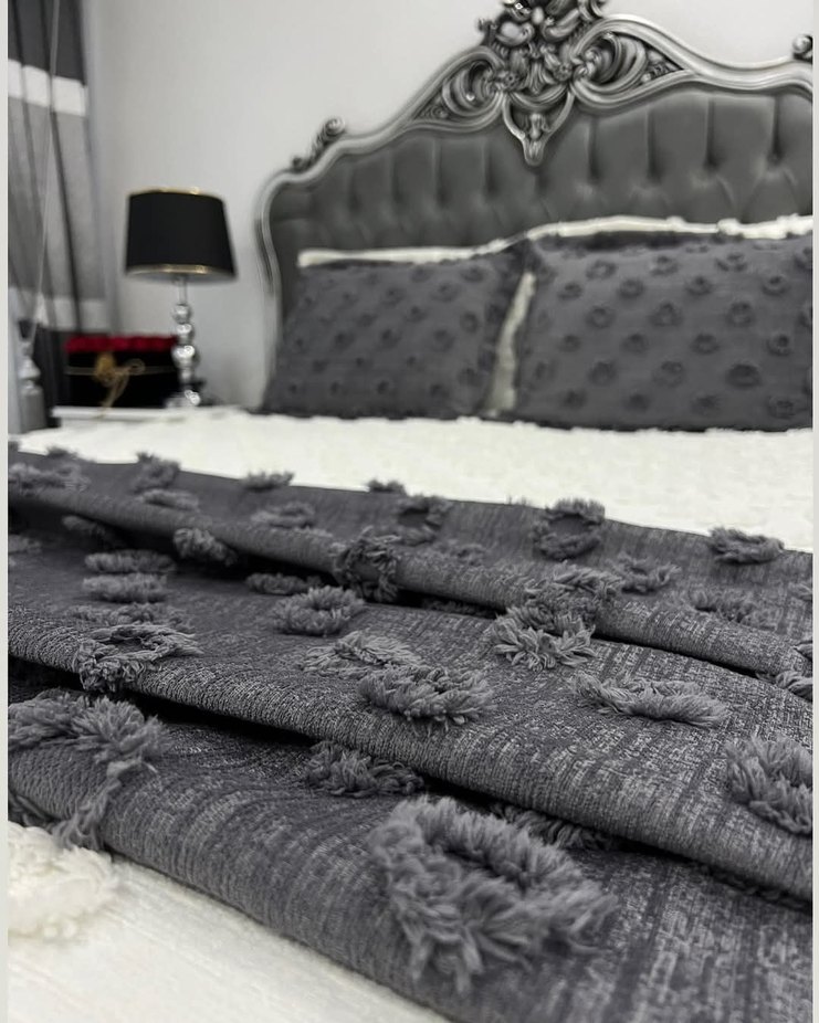 Nakışlı desenli gri yatak örtüsü, dokulu detaylarıyla yataklara derinlik ve şıklık katar. Yumuşak kumaşı konfor sağlar. ️kremle grinin uyumu ikili kullanimi